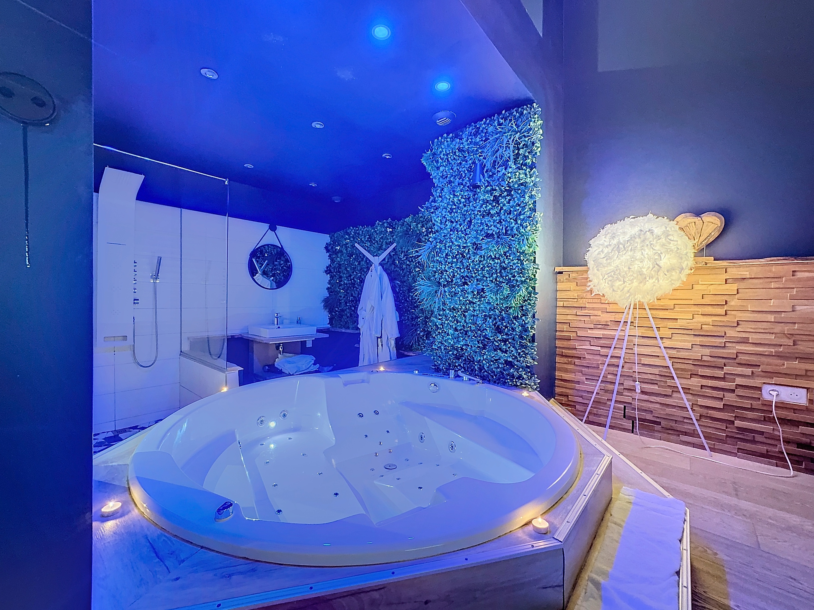 La chambre Loft vous propose une suite Douce et romantique teinté de bleu nuit et de beige ainsi que de murs végétaux. La chambre est équipée d'un spa privatif rond type baignoire balnéo, une douche à l'italienne, d'un espace salon avec canapé et écran plat, un espace cuisine avec micro onde, réfrigérateur et machine à café Tassimo (capsule de café, thé et chocolat fournies).