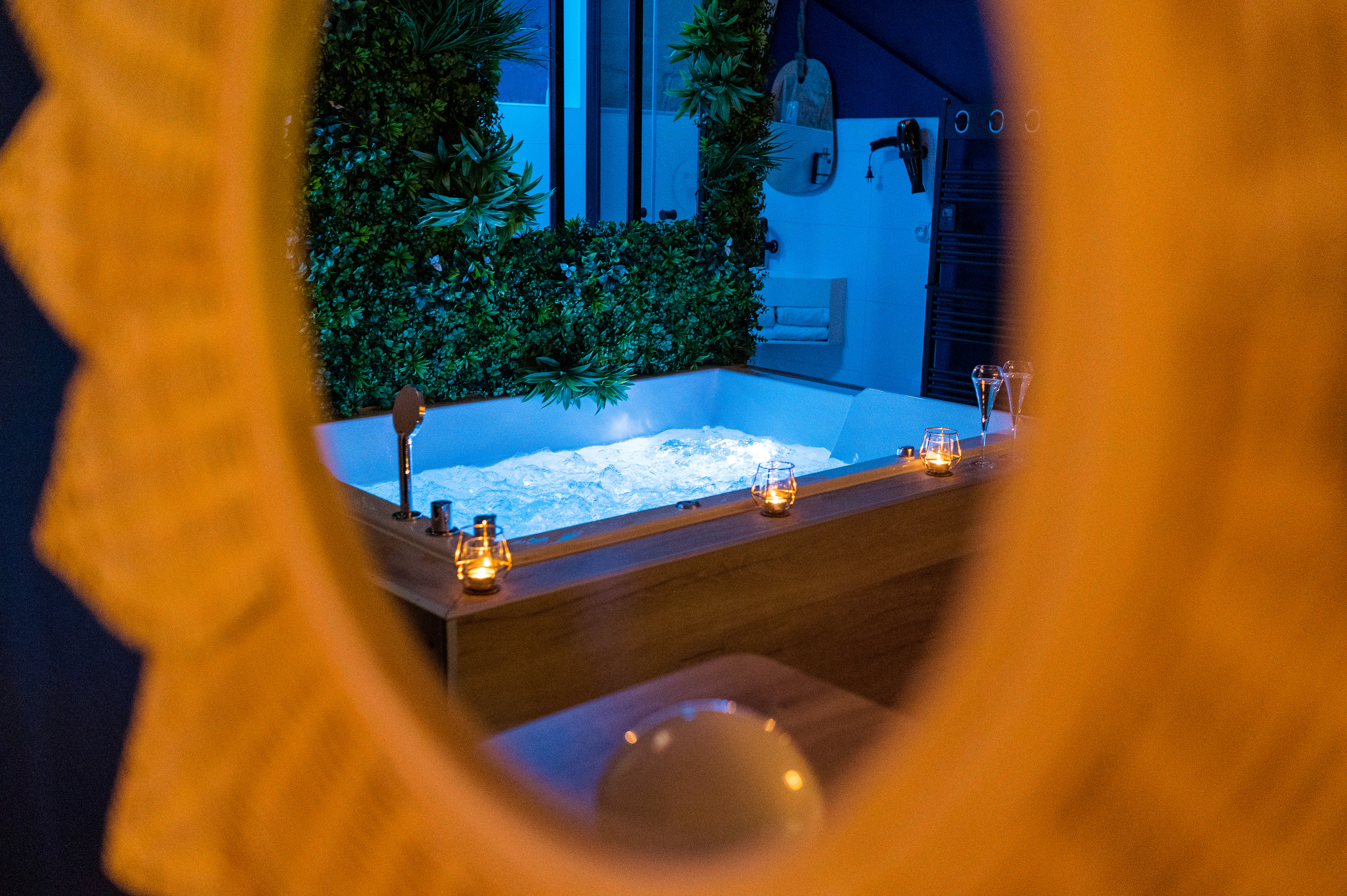 La chambre Loft vous propose une suite Douce et romantique teinté de bleu nuit et de beige ainsi que de murs végétaux. La chambre est équipée d'un spa privatif rond type baignoire balnéo, une douche à l'italienne, d'un espace salon avec canapé et écran plat, un espace cuisine avec micro onde, réfrigérateur et machine à café Tassimo (capsule de café, thé et chocolat fournies).