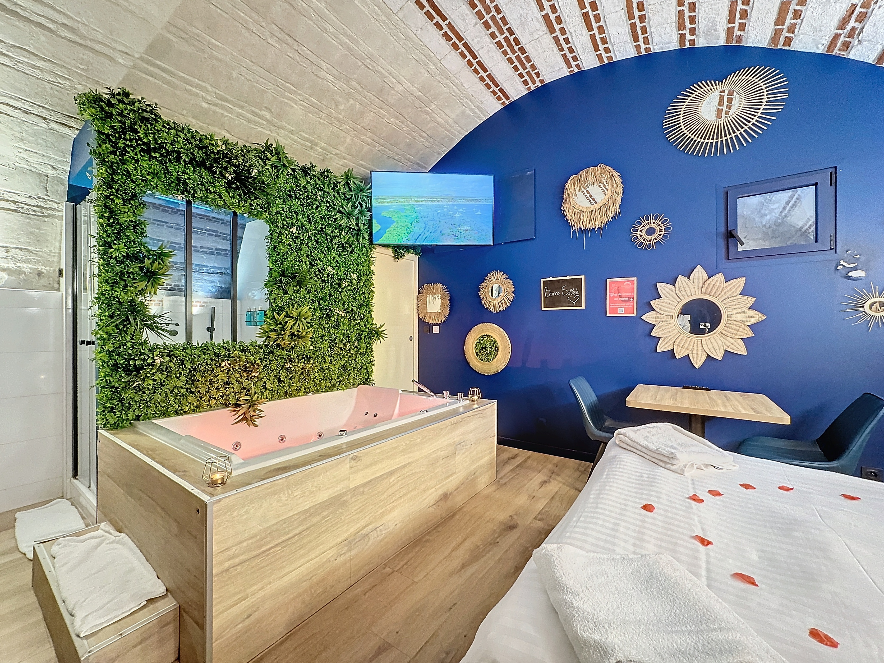 La suite L'envoûtante est une chambre avec jacuzzi privatif type baignoire balnéothérapie sur un thème tropical. Venez vous évader le temps d'une nuit à deux pour un voyage teinté de bleu marine, de bois et de rotin. La suite fait 25m2 et est équipé d'un jacuzzi privatif, d'une douche tropicale avec 4 programmes différents. Evasion assurée pour un weekend romantique réussi. Le linge de lit, les peignoirs et serviettes sont fournis.